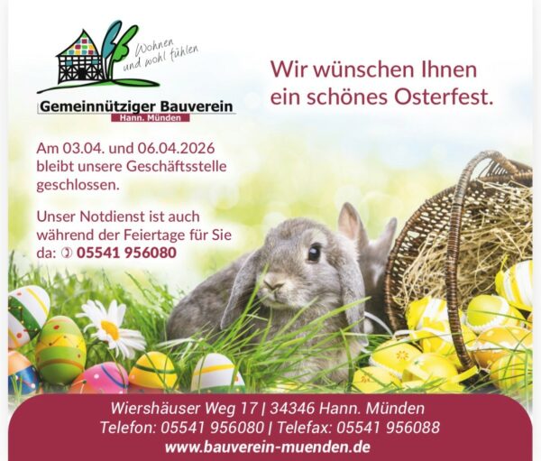 In Notfällen steht Ihnen unser Notdienst unter notdienst@bauverein-muenden.de oder unter der Telefonnummer 05541 956080 zur Verfügung.